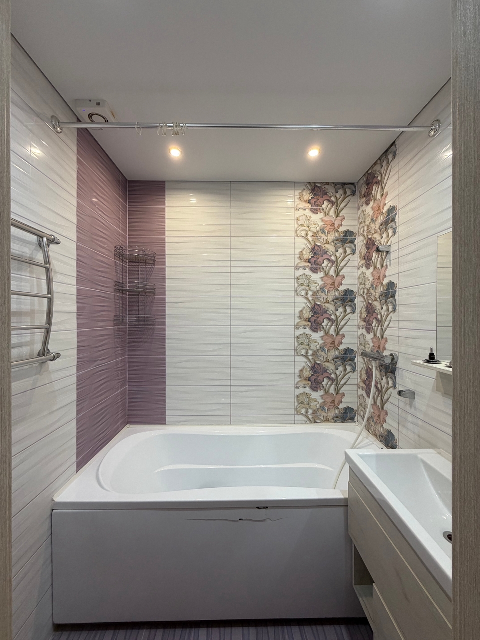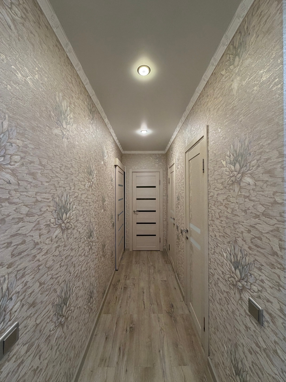 Натяжные потолки ,на полу ламинат, в кухне и санузле керамическая плитка.