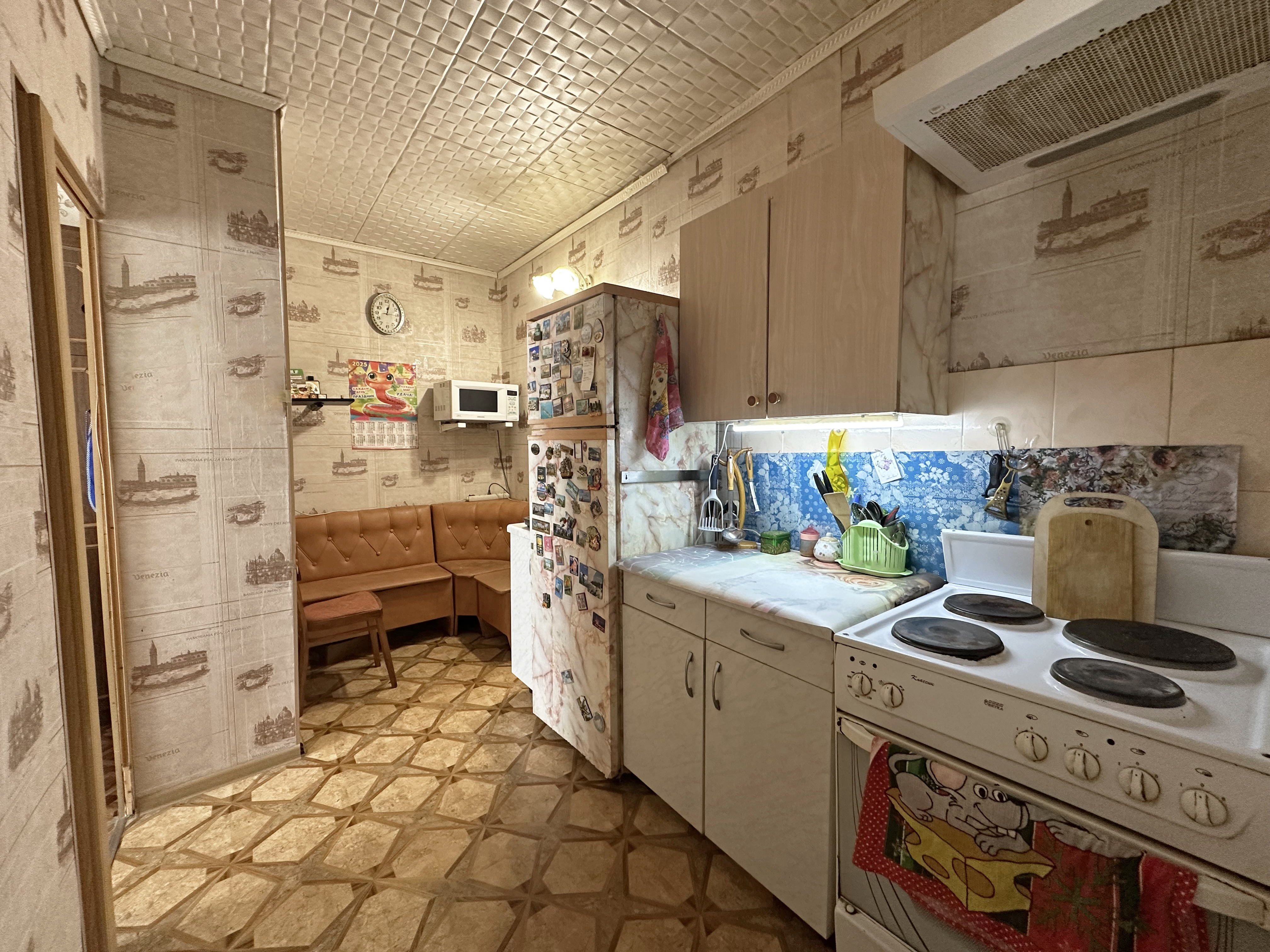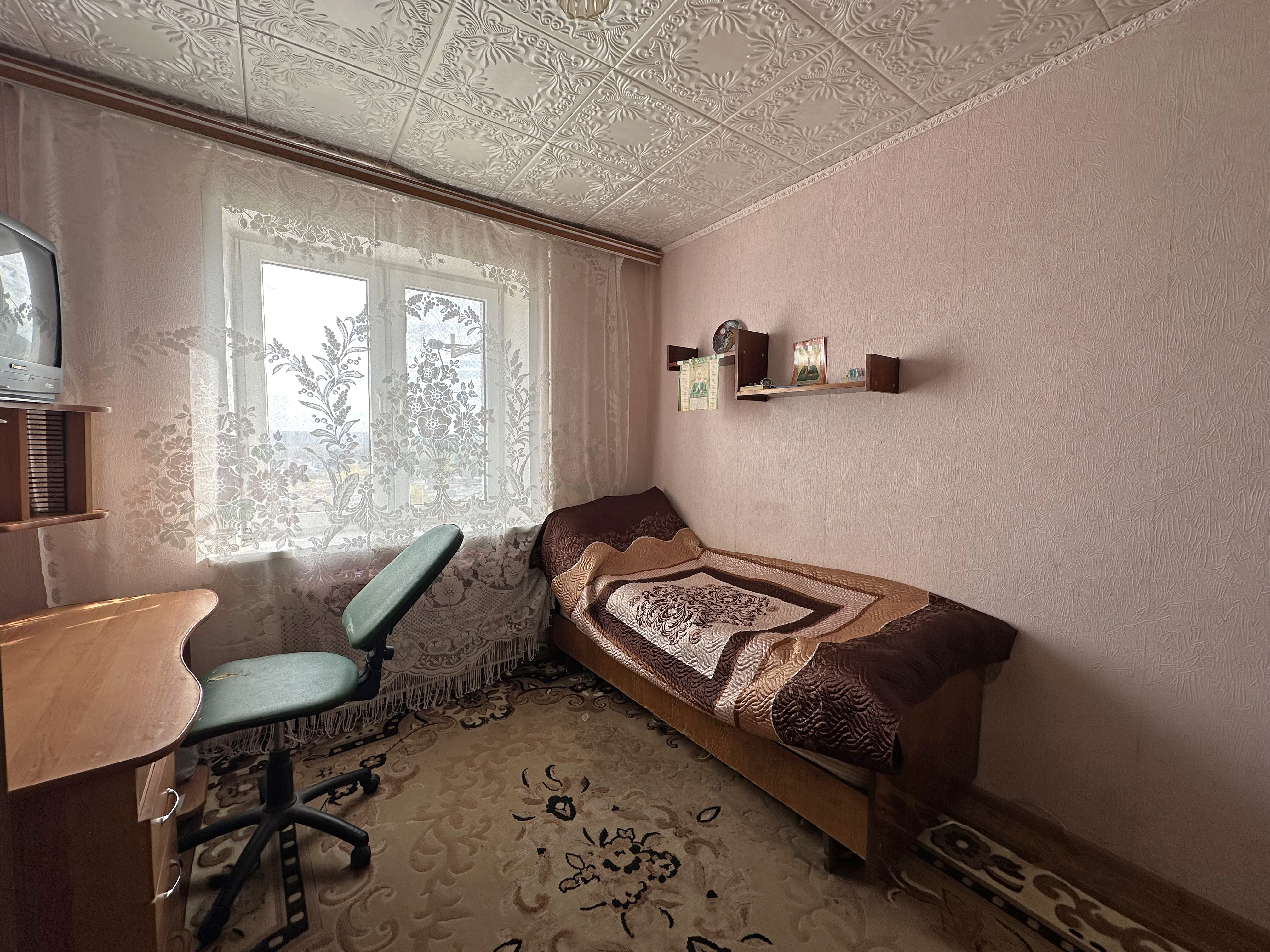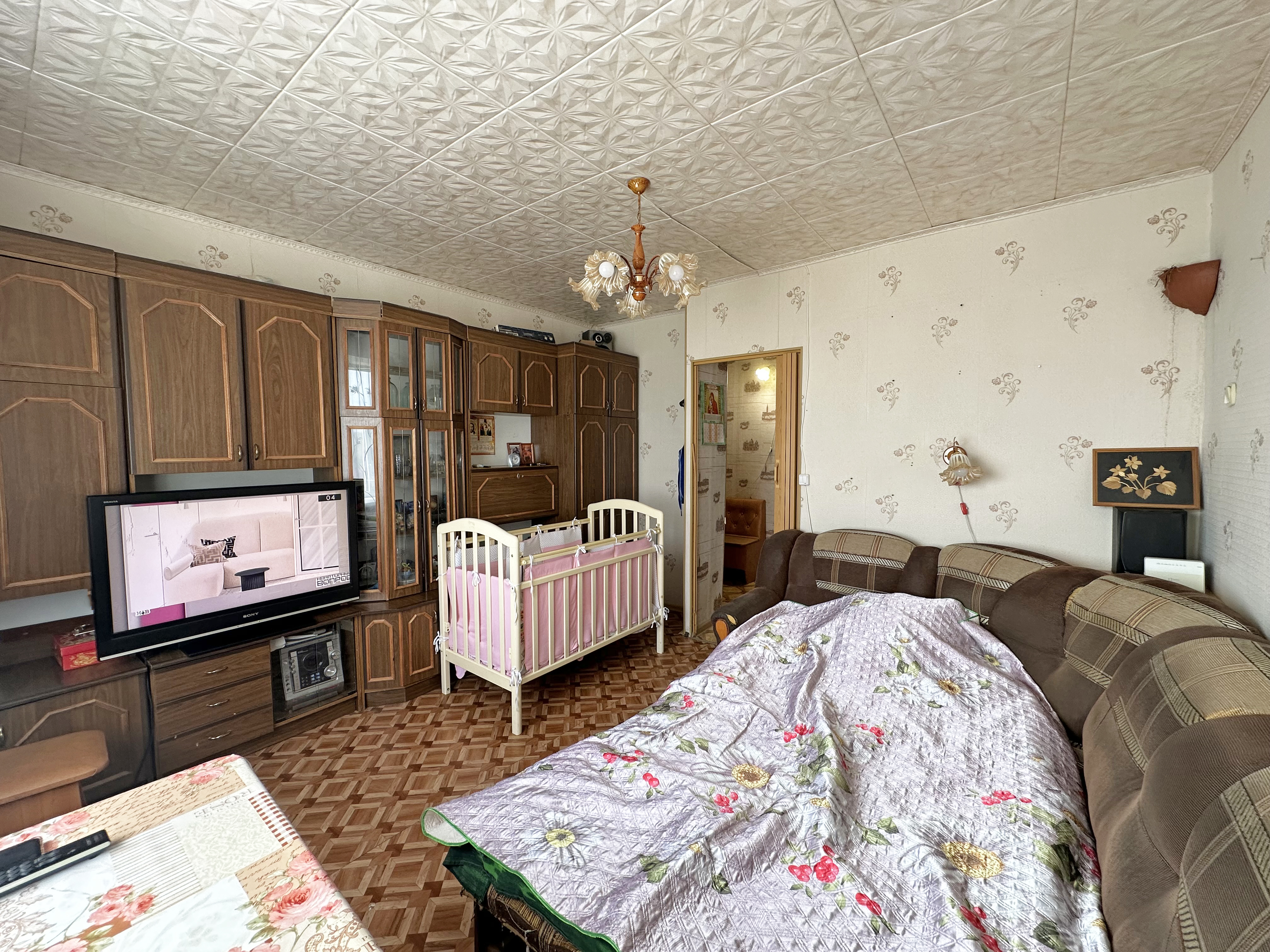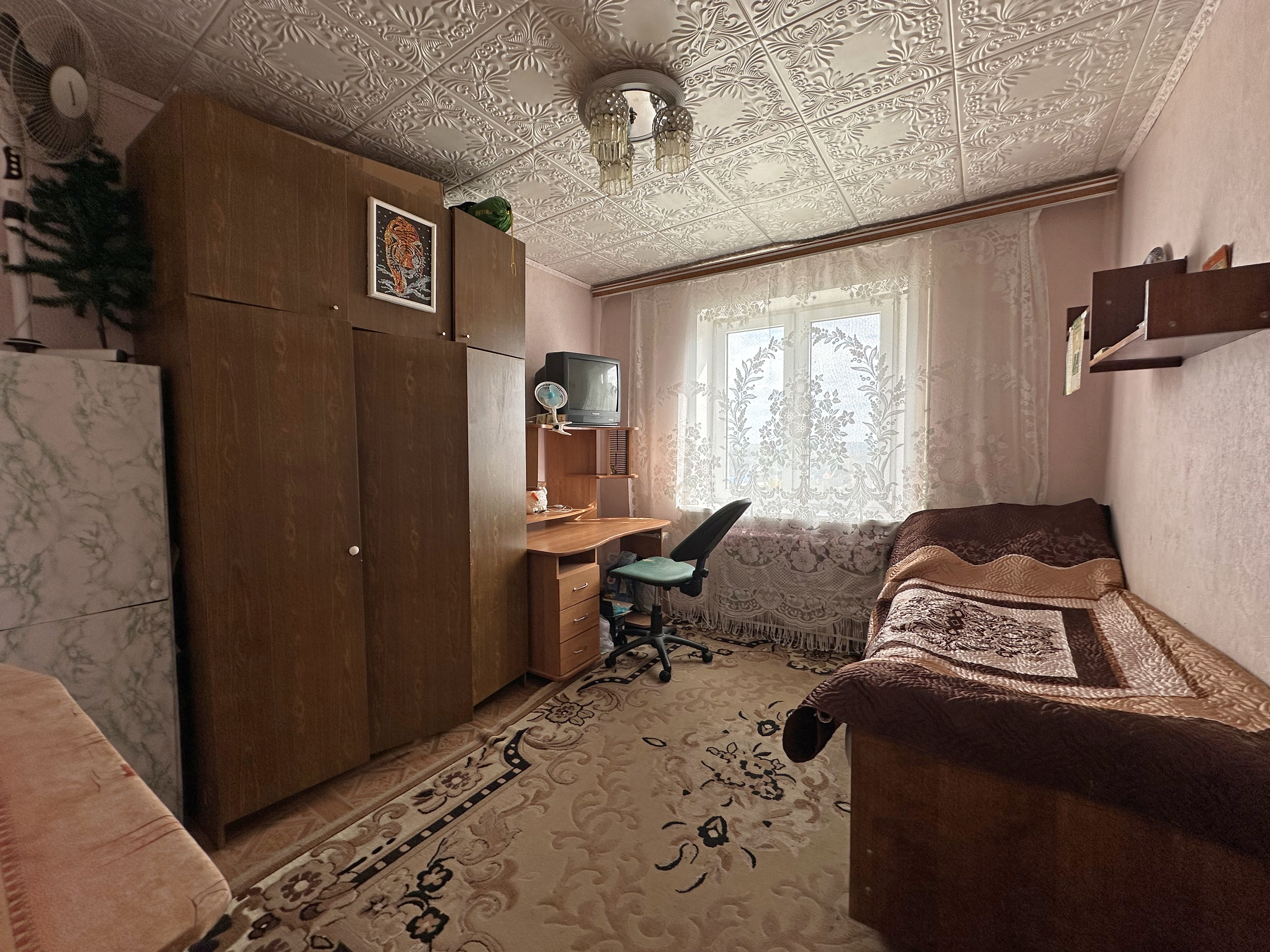 При продаже остаётся: кухонный гарнитур, вытяжка, мягкий уголок, холодильник, стенка, диван, стол, карнизы и тюль, шкаф, компьютерный стол, кровать, телевизор.